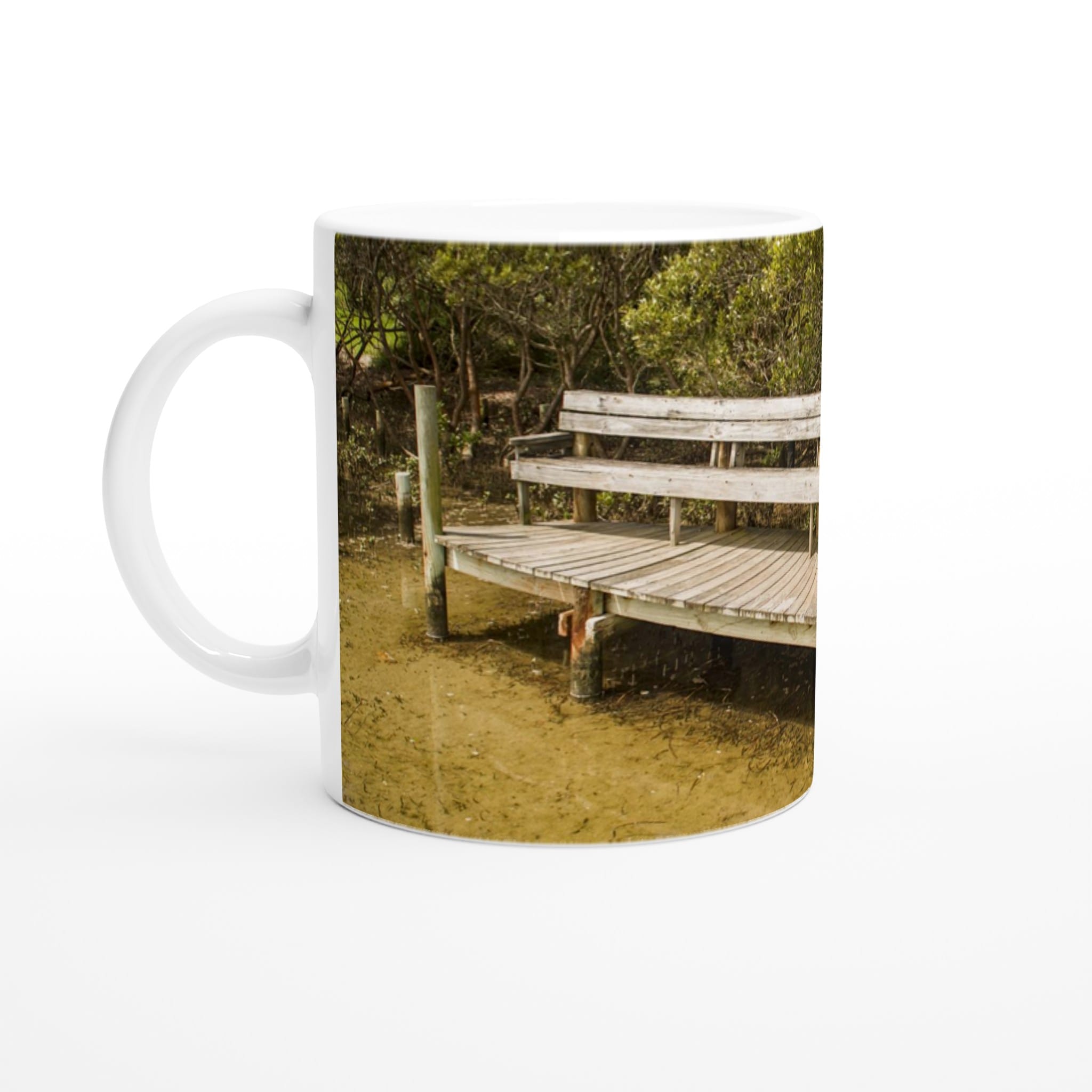 This exquisite 330ml (11oz) Merimbula Boardwalk ceramic mug captures the calm, natural essence of the iconic wooden path winding through lush mangroves.
